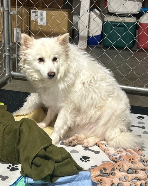 Miska is a beautiful white Spitz who was rescued from a puppy mill and is now ready for a fresh start in a loving home. She is wonderful with people and does great with kids—sweet, gentle, and happy to soak up attention from her humans.